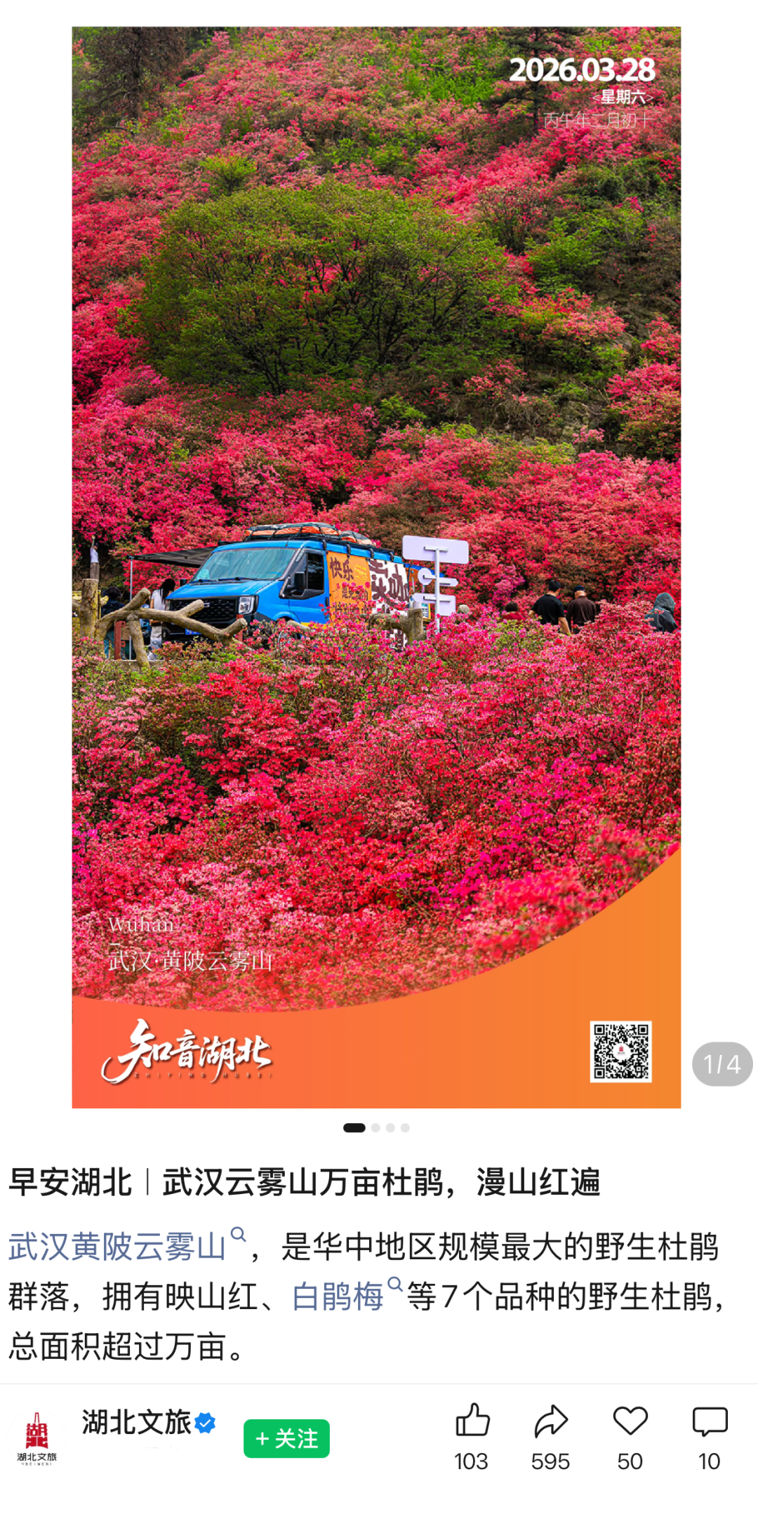 “5點(diǎn)半就起床了,自駕去武漢木蘭云霧山看杜鵑,感覺(jué)很值得,明年還要去!”北京游客默默在社交媒體上放出大量木蘭云霧山的美照,表示“春天一定要去一次木蘭云霧山,3到5月漫山遍野的映山紅盛開(kāi),真的美到失語(yǔ)。”