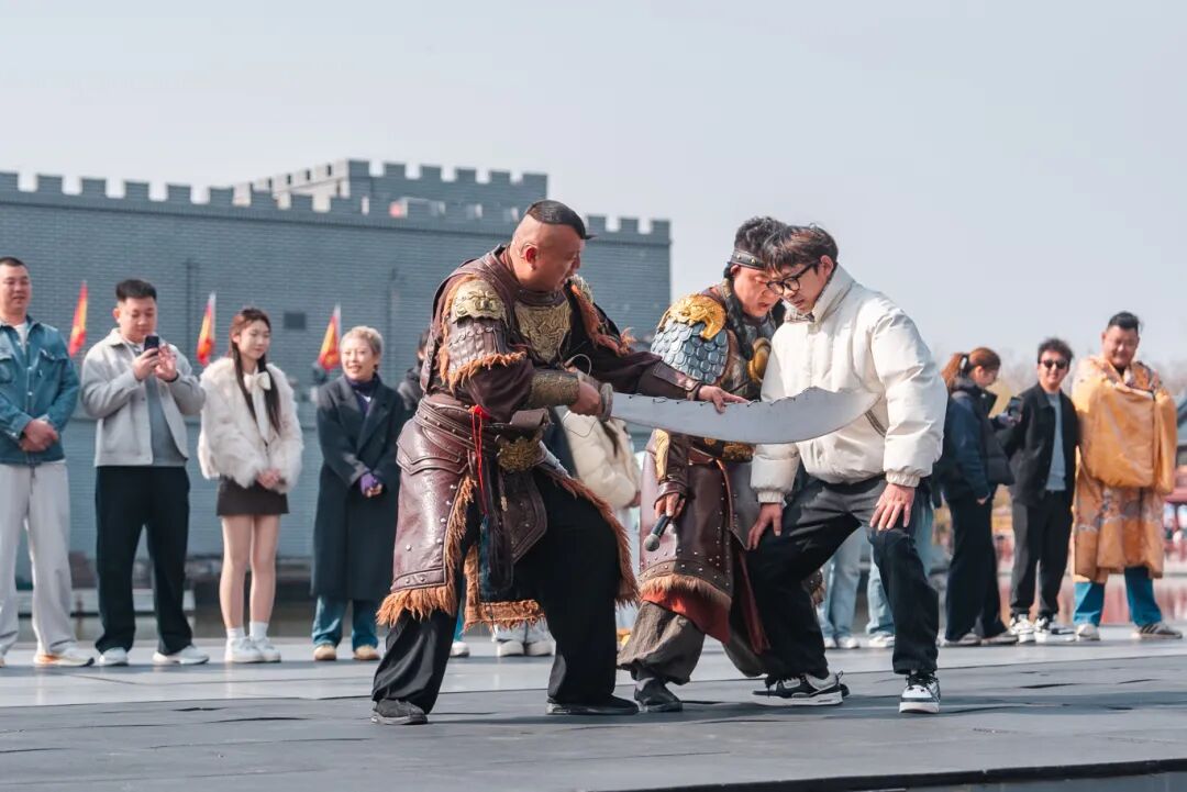 清明上河園每日上千場演出中,藏著無數(shù)互動機(jī)會?!洞笏巍|京保衛(wèi)戰(zhàn)》演出前,你可以盤金國大將軍,歡樂值拉滿,《岳飛槍挑小梁王》演出前,體驗(yàn)飛身上馬,矯健的你可能一不小心就會贏得終身卡。