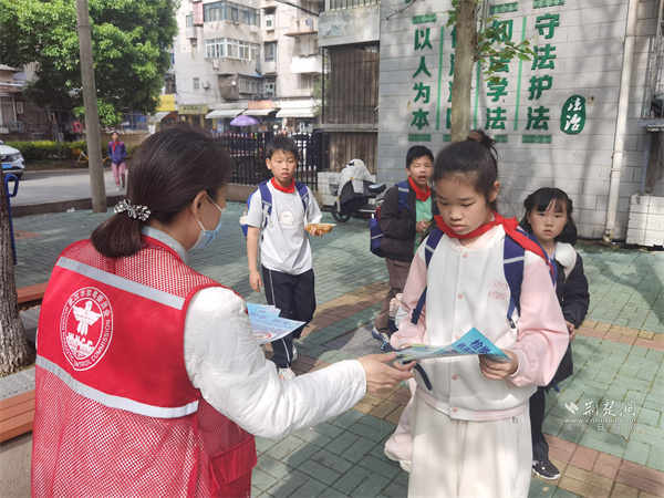 禁毒社工向?qū)W生發(fā)放禁毒宣傳單頁(yè)。 通訊員供圖