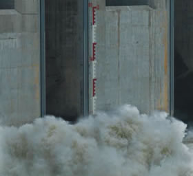 大壩下游,浪花濺上68米標尺點。