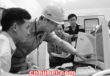 三峽總公司總經(jīng)理陸佑楣在泄水閘集控室現(xiàn)場了解泄洪閘監(jiān)控情況。