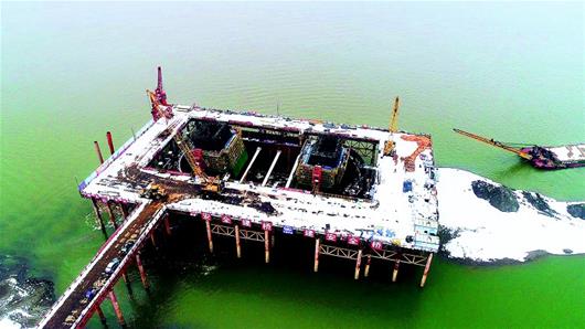 1月1日,建設(shè)者在赤壁長(zhǎng)江大橋上忙碌著。連日來,中鐵大橋局五公司項(xiàng)目部廣大建設(shè)者放棄元旦節(jié)日休息,不分晝夜,不畏嚴(yán)寒,加緊 施 工 ,于2018年 12月31日完成南岸灘橋首個(gè)水中墩承臺(tái)施工。目前南岸灘橋11個(gè)水中墩承臺(tái),已經(jīng)開工9個(gè),各作業(yè)點(diǎn)全面開花。(視界網(wǎng)馬永斌 攝)