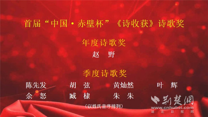 “赤壁杯”《詩收獲》詩歌獎由赤壁市委宣傳部、長江文藝出版社長江詩歌出版中心和中國詩歌網(wǎng)聯(lián)合主辦。本屆詩歌獎設(shè)“年度詩歌獎”一名,獎金5萬元;“季度詩歌獎”七名,獎金各1萬元。