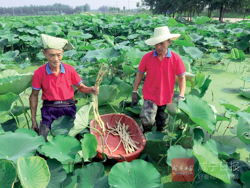 近日,在陸溪鎮(zhèn)工業(yè)園門口,村民們正在荷塘里采收藕帶。