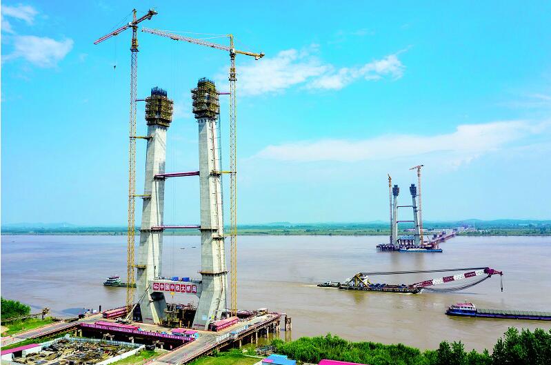 8月21日,赤壁長江大橋正在進行南北主塔中塔柱施工,南北主塔高度達到了133米,占總高度的60%左右。赤壁長江大橋連接赤壁市與洪湖市,主橋是雙塔雙索面斜拉結(jié)構(gòu),主塔為H形。承建單位中鐵大橋局在高溫天氣縮短白天施工時間,早晚補工,保障施工進度不因酷暑延后。預(yù)計明年2月能按期實現(xiàn)主塔封頂?shù)仁┕つ繕?。(視界網(wǎng) 馬海斌 攝)