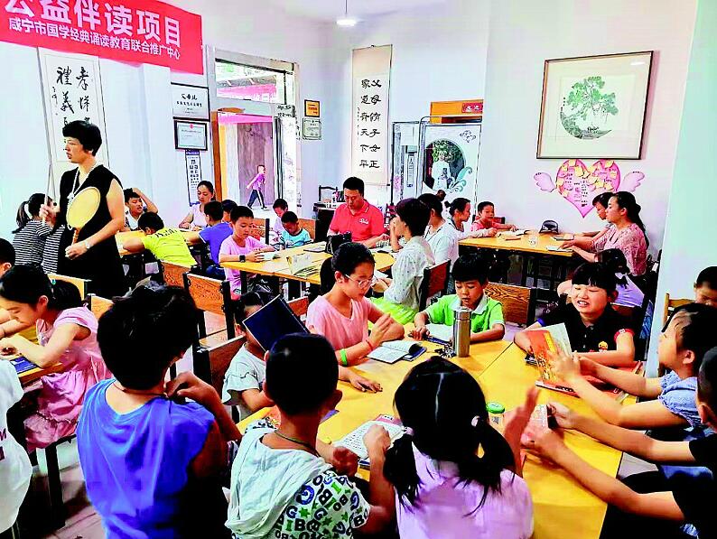 圖為:咸寧市咸安區(qū)溫泉街道南昌路社區(qū)國學(xué)推廣中心火熱的學(xué)習(xí)場景。
