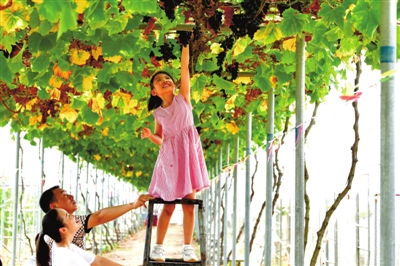 10月2日,嘉魚縣新街鎮(zhèn)世外葡萄園,一名小女孩正在體驗采摘樂趣。