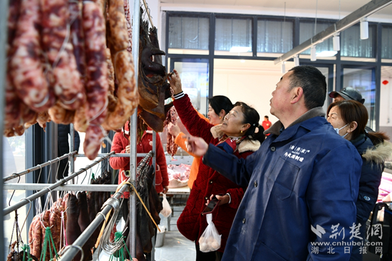 在肉類攤位前,剁了20多年肉砧板的胡金山割肉的手麻利多了——他邊賣肉,邊招呼顧客,今天喜遷新市場,瞧這秤也足足的。排著長隊(duì)購買“兩頭烏”豬肉的顧客不時盯著屏幕上中央電視臺拍攝采訪這位養(yǎng)豬大戶的專題片,有的掃一掃二維碼,看養(yǎng)豬場實(shí)況。