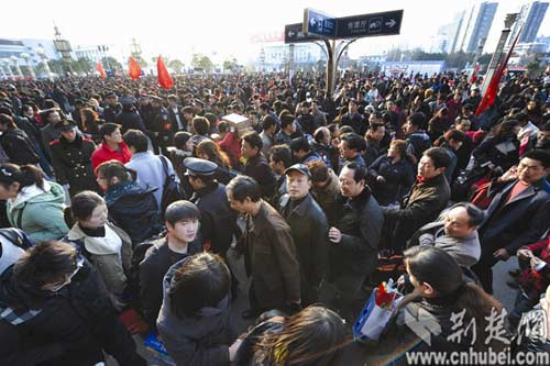 記者今日上午到武昌站轉(zhuǎn)了轉(zhuǎn),和春節(jié)幾天相比,站前廣場(chǎng)的客流明顯增多,幾趟臨客的發(fā)車招牌豎在廣場(chǎng)上,到點(diǎn)會(huì)有引導(dǎo)員引導(dǎo)旅客依次進(jìn)站?梢哉f是忙亂中仍然井然有序。據(jù)了解,昨天,鐵路春運(yùn)客流出現(xiàn)新高潮,武漢鐵路局共發(fā)送旅客51.14萬,再創(chuàng)歷史新高,旅客發(fā)送量約占全國(guó)鐵路旅客發(fā)送量的十分之一。