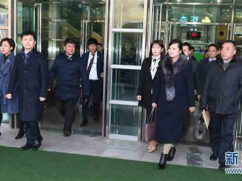 1月21日,朝鮮三池淵管弦樂團團長玄松月(前右二)通過朝韓邊境的韓國京畿道坡州市京義線韓朝出入境事務(wù)所前往韓國首爾。當日,朝鮮方面派遣三池淵管弦樂團團長玄松月率領(lǐng)的考察團經(jīng)由京義線陸路抵韓,為平昌冬奧會之際舉行的文藝演出進行事先考察。(新華網(wǎng))